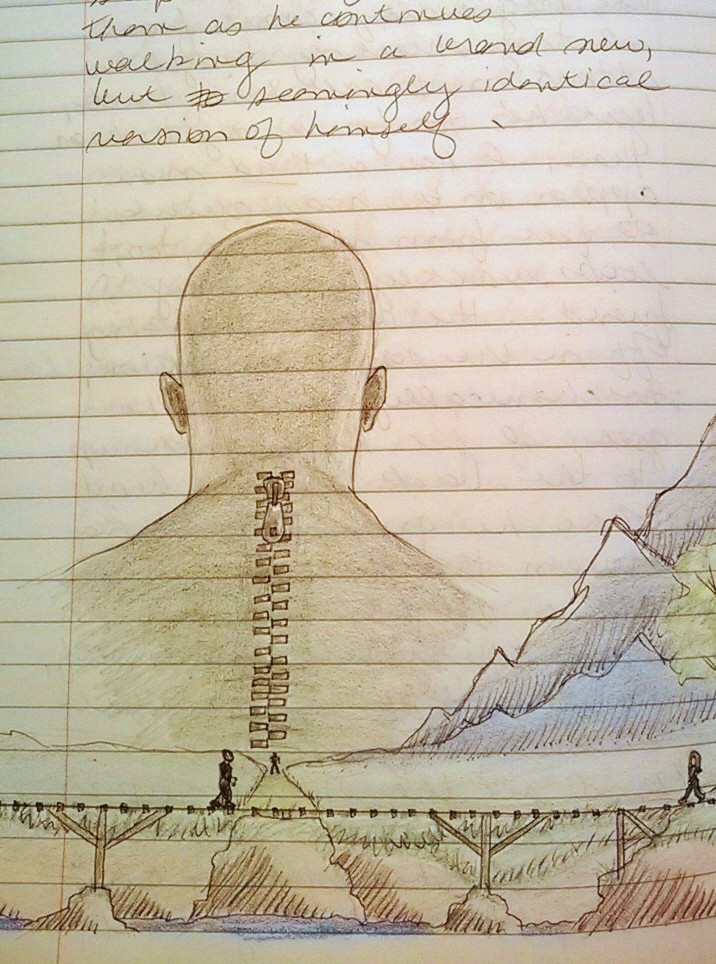 Then, to my surprise, a third man appears in the middle of the road about 50 feet away. Although his back is to me, I know that he, too, looks precisely like my friend. This third man begins walking away down the pale road’s center, but his movements are odd, mechanical. As I watch, he reaches his right hand up and back behind his neck where he grasps something firmly between his thumb and forefinger. With a slight tug, he unzips the whole of himself, from skull to spine’s base. The silver zipper teeth flash. His exterior self — clothes, skin, sunglasses — float to the dusty road as a single unit, and he steps out of and over them. Without breaking stride, he continues walking in a brand new, yet seemingly identical, version of himself, the man beside me, and my friend.